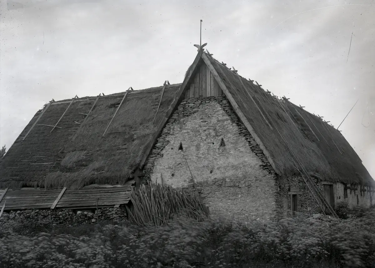 T v står tröskhuset med slitet halmtak. Mot tröskhuset har man byggt ett enkelt vedskjul, vedtravar står utanför. I vinkeln har man ställt upp en hop med färdigbarkad stör till bandtunar med rotändarna stående uppåt, så de inte skall murkna i onödan.