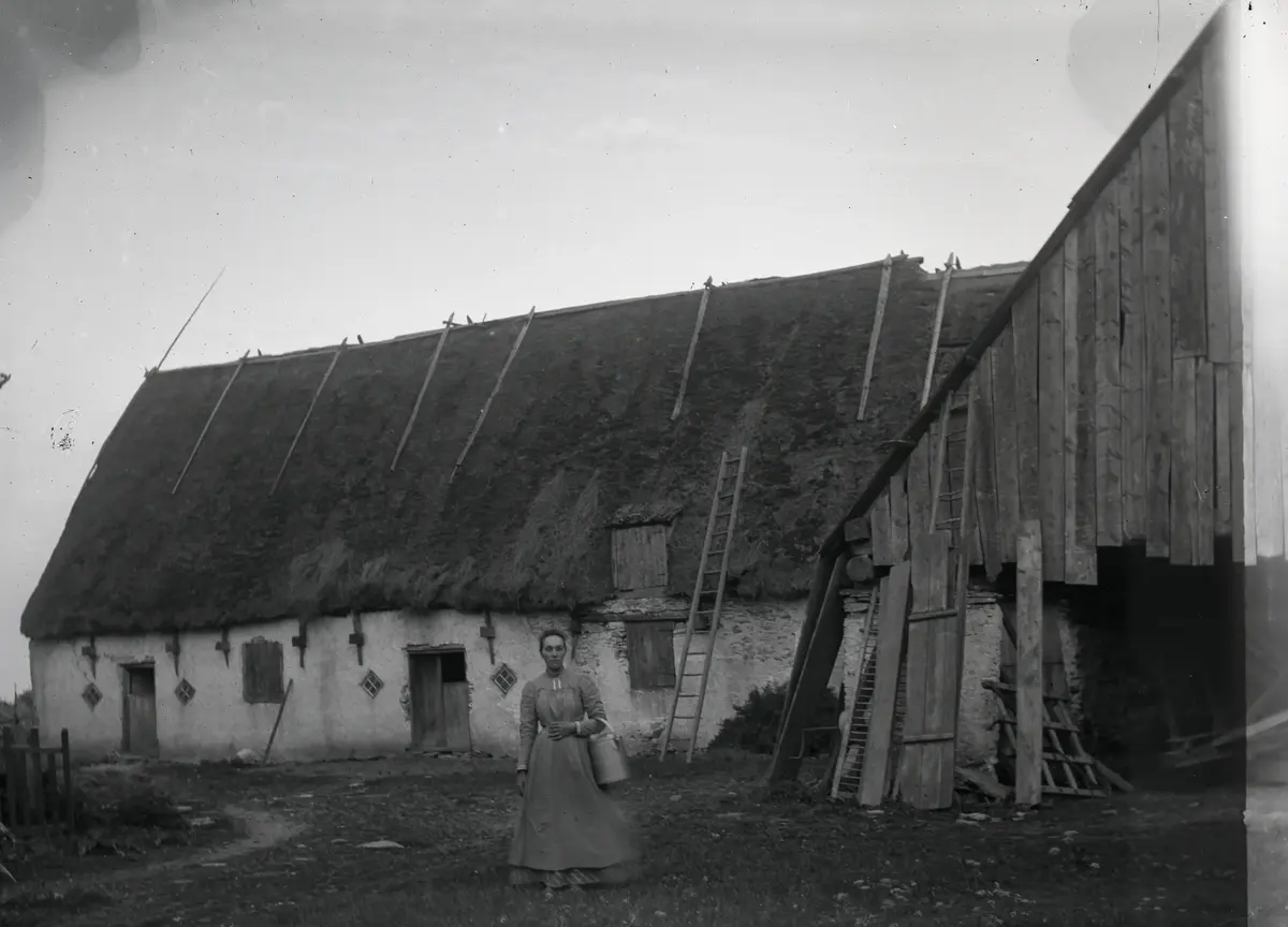 Dottern på parten Vendla Larsson står vid tröskhuset framför ladugården. Vi ser ladugårdens två fähusdelar med hoimdar, hörum. Det högra fähuset innehåller sannolikt både stall och kohus iom att dörren är bredare. Invid dörrarna sitter rombformade fönster, helt unika! I tröskhuset verkar vandringen vara urriven och nu tycks man ha hö eller halm här. Stegar finns här liksom invid de flesta uthus. De är smalare upptill än nedtill, något som var brukligt, särskilt på långa stegar.