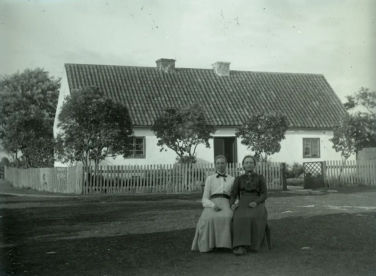 Denna soliga sommarkväll sitter dotter Anna och moder Anna och poserar framför manbyggnaden.