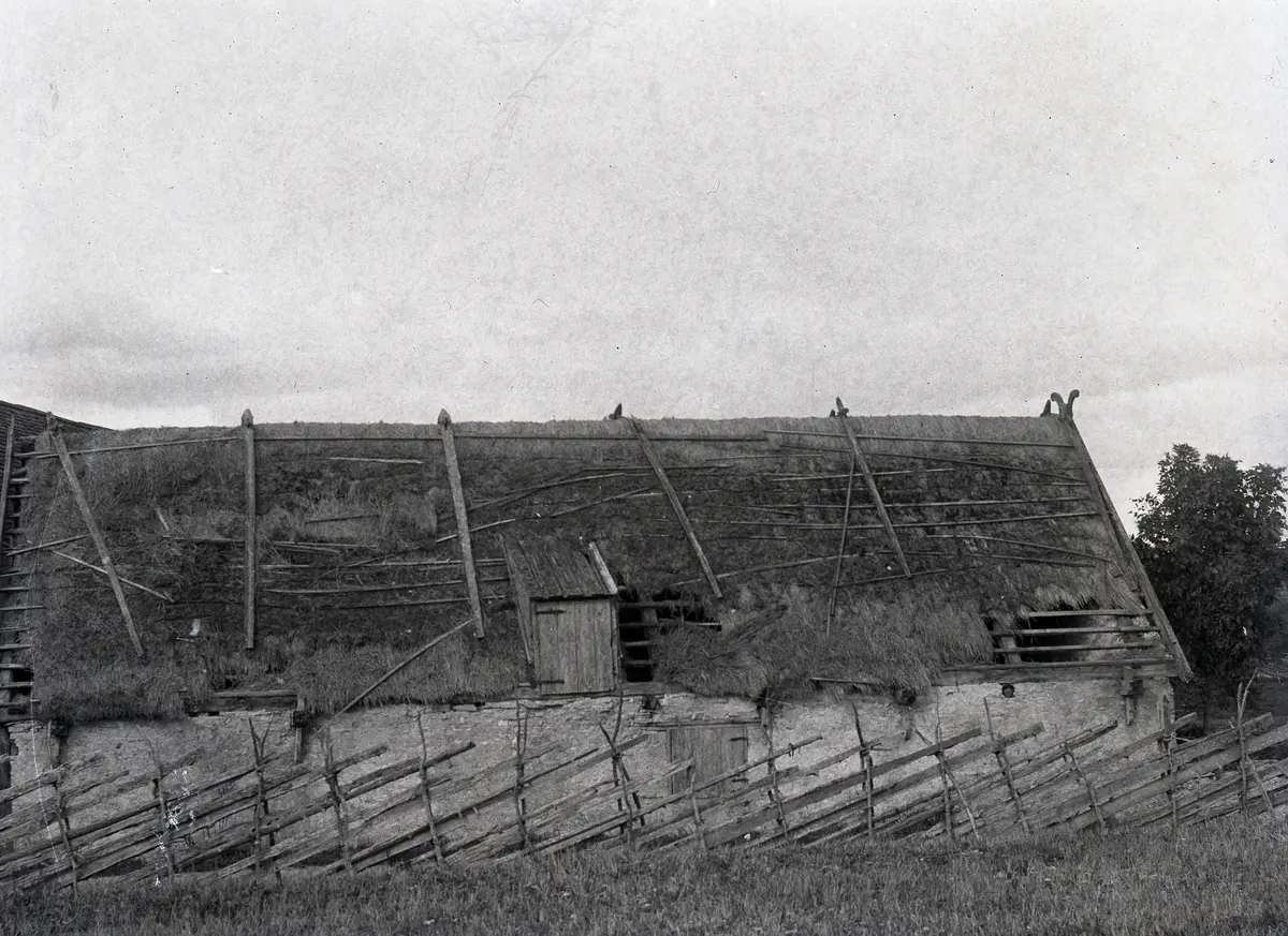 Masse tyckte tydligen att lammhuset var så märkvärdigt att han tog en tredje bild där det var med. Man ser att nu är det övergivet med hål i taket, fågelholken har ramlat ner. Foderluckan i taket och hoimdluckan i väggen tyder på att byggnaden åtminstone delvis använts till djur.