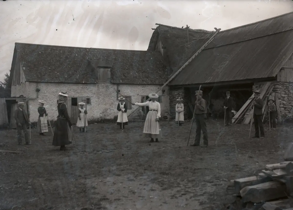 Masse har förevigat grannlagets ungdomar när de leker en än så länge icke identifierad lek. Men han har också fångat en del av den rivna ladugården med tröskhus. Vänstra ladugårdsdelen har nog bytt agtak mot spåntak och därmed fått lägre nock. Byggnaderna ser ut att vara i rätt gott skick, så det är svårt att förstå varför de revs några år efter bilden togs.