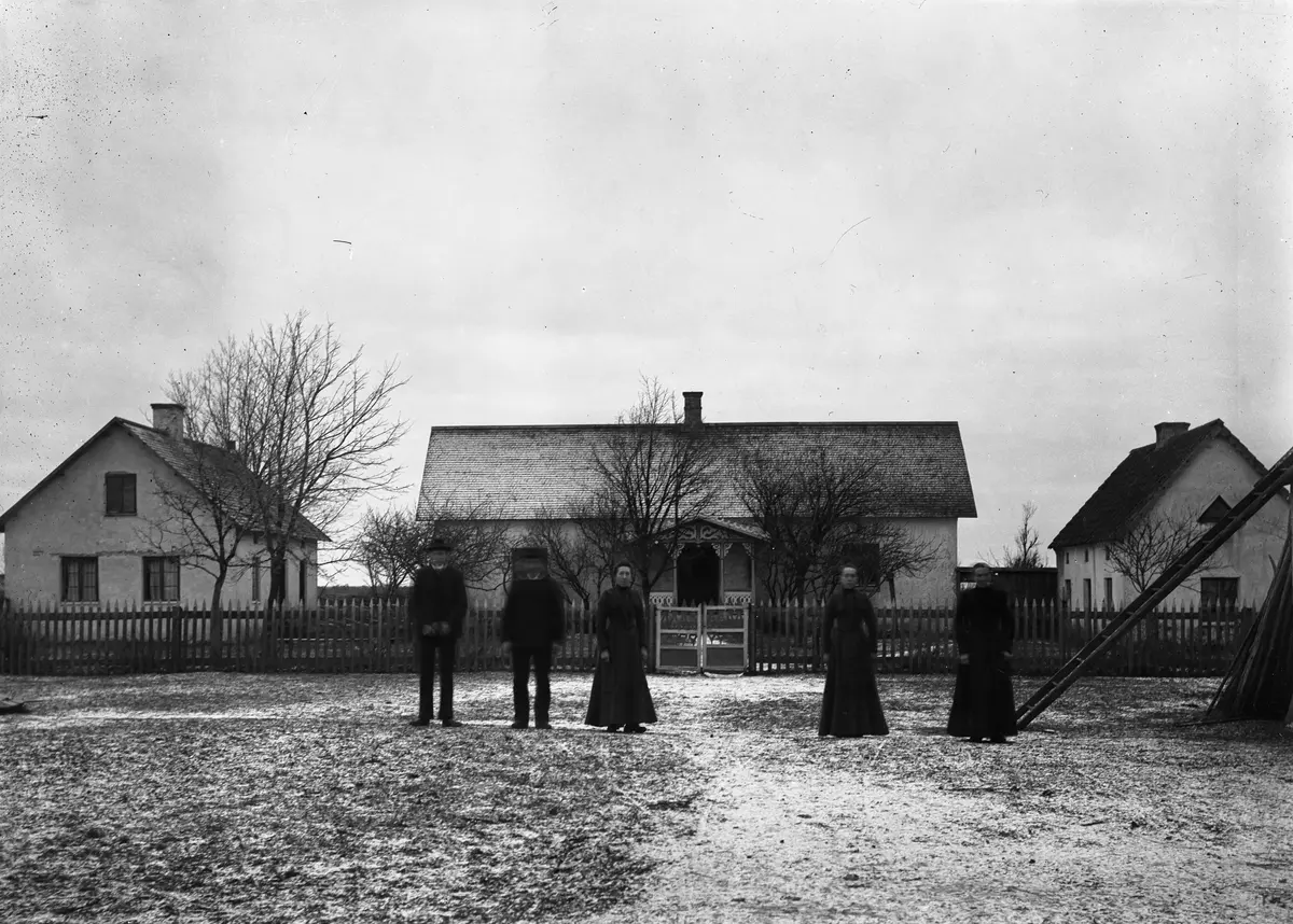 På bilden ser vi från vänster troligen Jakob Nilsson 44 år, svärfadern Jakob Gardell 67 år, döttrarna Anna 18 år och Elin 16 år, samt hustrun Anna 39 år.
