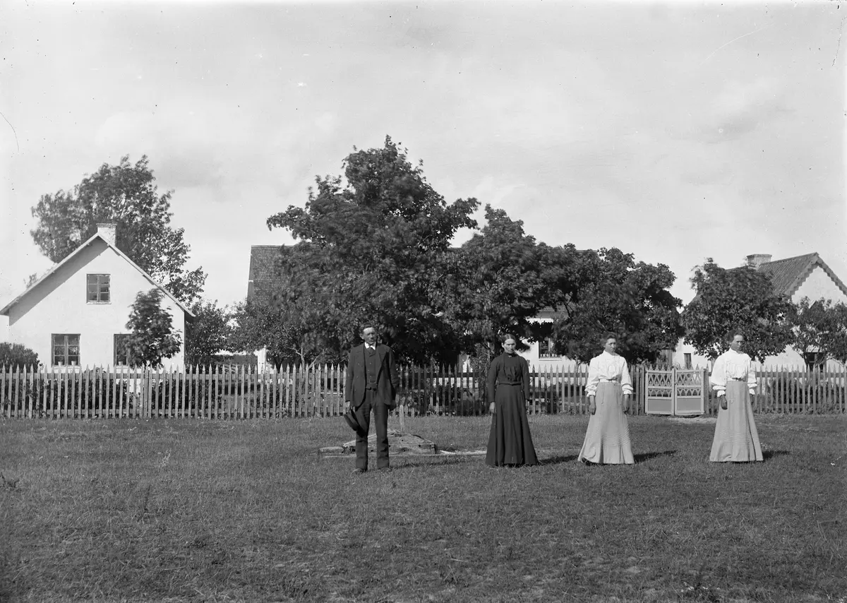 Masse har tagit en sommarbild av den finklädda familjen 13 år efter förra gången. Svärfadern Jakob Gardell är död liksom första hustrun Anna. Här står Jakob Nilsson 57 år, hans nya fru sedan 4 år Josefina Johansson 50 år, samt Jakobs döttrar Anna 31 år och Elin 29 år, som måste ha varit hemma på besök. Döttrarna har fått stå så de inte skymde den fina grinden!