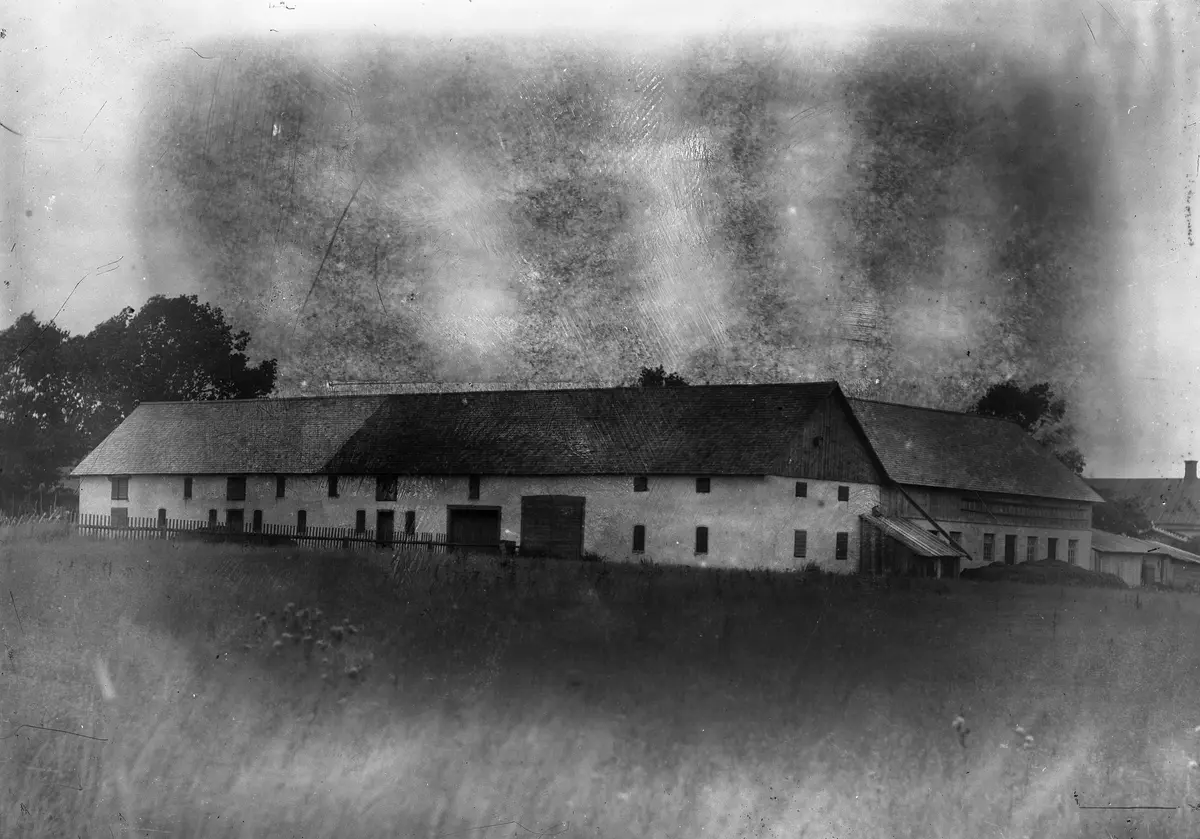 Ladugården som Nilssons byggde i två etapper, den långa delen längs vägen 1888 och delen i vinkel 1912 är ett mäktigt bygge. Här är just den nya delen färdig och en dryg tredjedel av del äldre delen har fått nytt spåntak. Den äldre ladugården innehöll två kohus, stall och grishus (?) till vänster och en mycket stor lada till höger. Den nya delen innehöll ytterligare fähus.