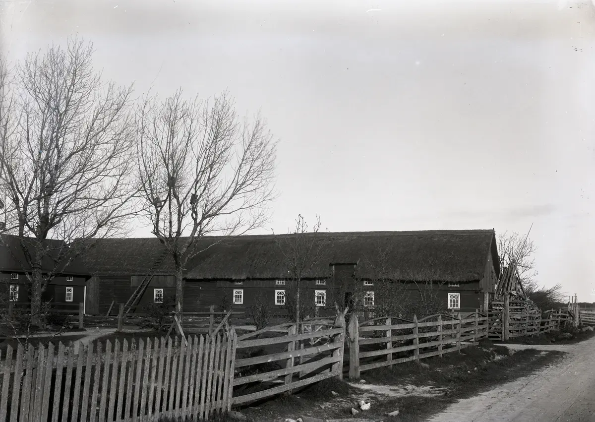 Ladugården är avbildad från vägen med gårdspartens staket och slantunar i förgrunden. Det är en lång ladugård, troligen uppförd i etapper, se Bild 866 och 867.