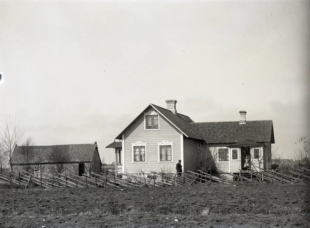 Denna överblick från öster visar både bostadshuset och den lilla ladugården. Man ser att bakbygget sannolikt innehåller kök och ett litet brygghus ute på gaveln och att vardagsingången här tom har veranda. När det nya bakbygget gjordes flyttades vardagsingången till andra sidan. Ladugården kan vara en bit av en återanvänd bulladugård som flyttats hit och panelats in. Den hade fähus till vänster och lada till höger.
