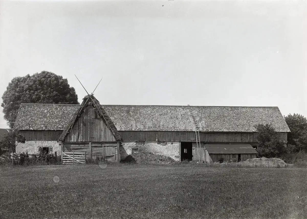 Masse har tagit två intressanta bilder av ladugårdens baksida. Vi ser att ladugården är rätt tagen av tidens tand och hela uthuskoplexet ersattes 1926 med en mycket stor vinkelbyggd ladugård med lada. Åldern på denna ladugård är svårbedömd, men 1800-talets första hälft kan vara rimlig. Fähusdelen är byggd i sten och laddelen sannolikt i bulteknik. Foderloftet i resvike med spåntak bör ha kommit till på 1880-talet, här håller man på och lappar spåntaket vid stegarna. Ursprungligen hade alltså ladugårdens väggar samma höjd som det ålderdomliga bulbakbygget med agtak. Om bulbakbygget är en rest av en äldre ladugård som stått på denna plats, eller om den flyttats hit är okänt. Det ser ut som om den innehållit ett fähus, den har en hoimdlucka på gaveln. Hur som helst är den äldre än ladugården i övrigt. Bilderna är inte tagna samtidigt.