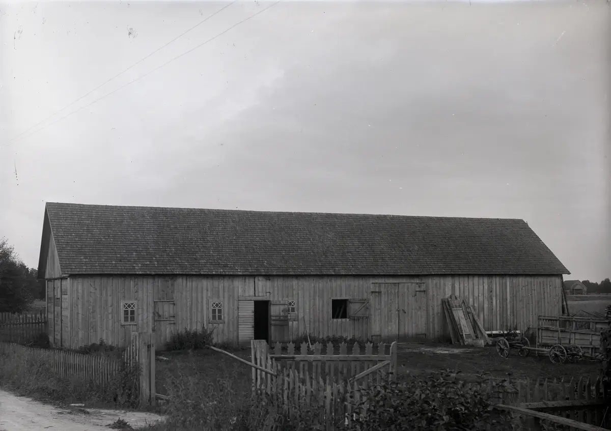 Ladugården var byggd omkring 1900 i resvirke under spåntak, men vi ser att gaveln är i bulteknik. Den innehöll troligen kohus till vänster, därefter stall och hoimd och till höger lada.