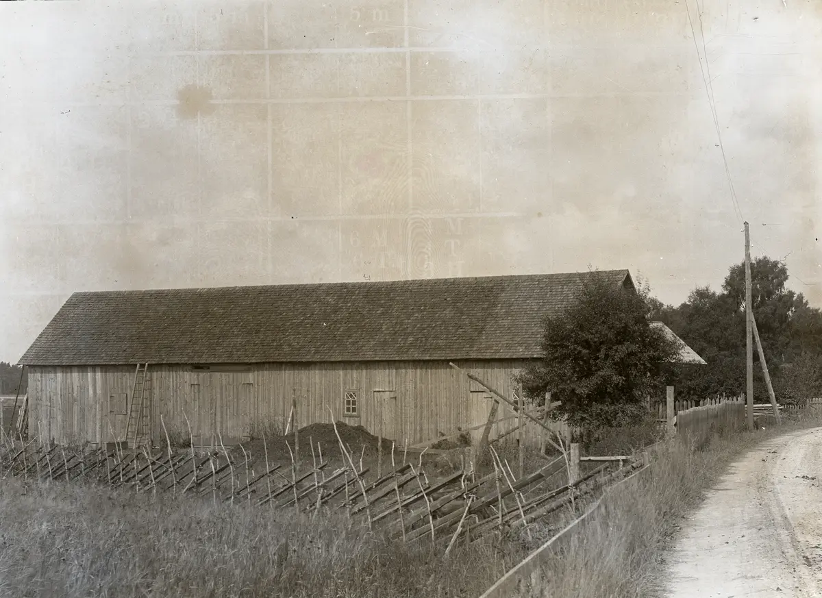 Masse har stått på vägen och tagit denna bild av ladugårdens baksida. Det här var en vanlig byggnadstyp på ladugårdar kring förra sekelskiftet, särskilt på mindre gårdar. Denna ladugård revs 1934 och man byggde en betydligt större i sten med foderloft av trä.