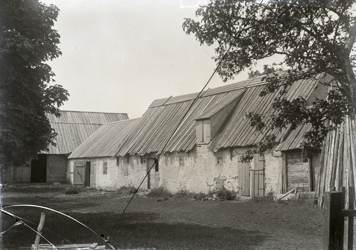 Eftersom tomten är inklämd mellan Lasusbackars rasbrant och Käldvägen och därför är synnerligen långsmal, låg ladugården och manbyggnaden i rad. Vi ser många och stora uthus trots att det här var en liten gård. Längst t v skymtar en stor tvärställd bullada under faltak i gott skick, sannolikt betydligt yngre än ladugården t h. Mot ladan står ett lite äldre stenhus under faltak, som kanske innehöll vagnbod och gris/lammhus. T h är den gamla ladugårrden, inte från 1700-talet, men äldst av ladugårdsbyggnaderna. Den innehöll två fähus med hoimd längst bort. Hönshus fanns också här med tanke på luckan vid marken. Faltaket börjar bli rätt taget. Längst t h skymtar en bulbod. Ladugården stod kvar till 1925, då man rev alltihop och byggde en ny på ladans plats.