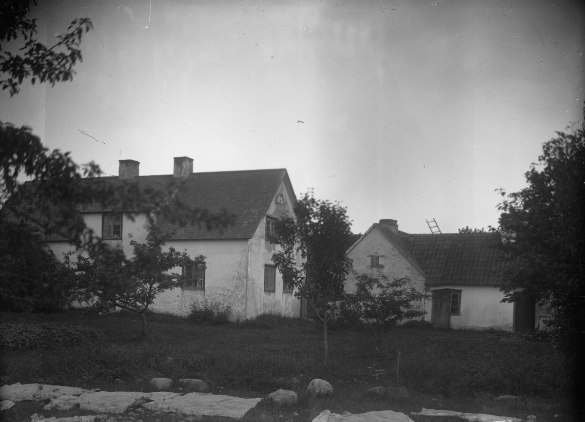 Vi ser den gamla manbyggnadens baksida på Smiss södra part. Huset är säkert det stenhus Christen Larsson byggde 1795, men höjt, försett med frontespis och förstorade fönster på 1840-talet. Det ser ut att vara i gott skick, men ändå rev man det och byggde ett stort nytt hus 1929.T h syns brygghuset mad bakbygge som bla innehöll smedja.