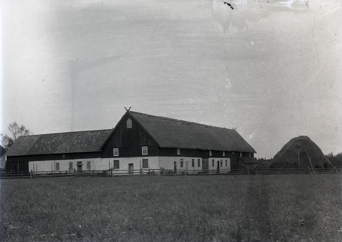 Här ser vi hela den stora vinkelbyggda ladugården från 1910. Det är nog fähus i hela ladugården från ladan och fram på gaveln, det är 3 gödseldörrar på baksidan (en syns dåligt) samt en mitt på gaveln. Även vinkeln verkar ha innehållit fähus. Den måste ha varit äldre, för spåntaket är redan lappat. Hela denna fina ladugård brann ner 1976 och en ny för tiden modern ladugård byggdes 1977.
