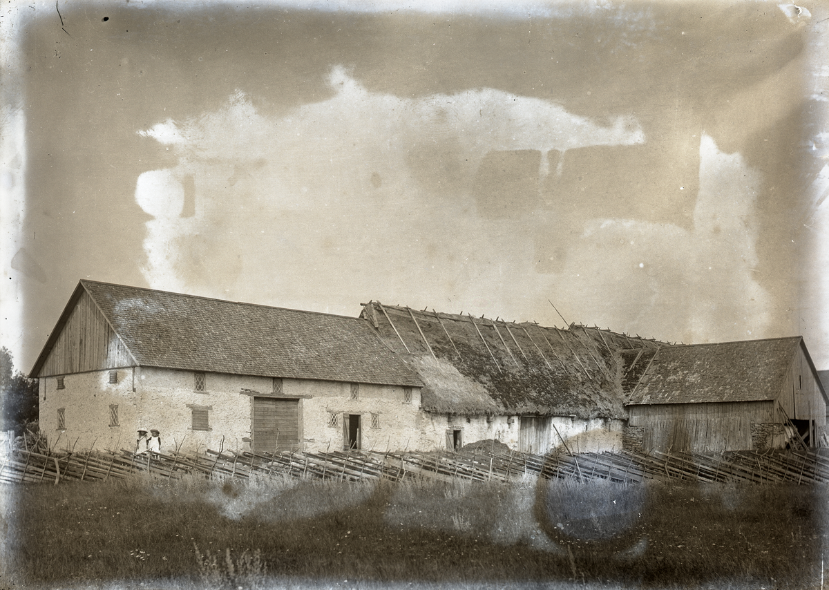 Här ser vi ladugårdslängan samt tröskhuset till grannparten. T v i den nya delen var det nog gris/lammhus, det är en hoimdlucka på baksidan, men ingen gödseldörr, det brukade gris/lammhus inte ha. Sedan var det portlider och därefter troligen stall. Sedan kom ytterligare ett portlider och sist fönsterlös lada, se bild 1112, 1113.