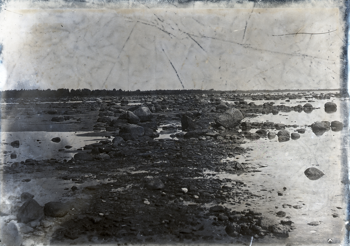 Masse har gått ner på stranden mitt inne i Lausviken en högsommardag med extremt lågvatten. Alla gråstenar i strandkanten och ute där det brukar vara vatten är synliga. Bilden är tagen ungefär utanför dagens badplats i Lausviken. Masarbods fiskeläge borde vara alldeles utanför bild t v och skogen ligger i grannsocknen Alskog, längst t h ligger Ljugarn.