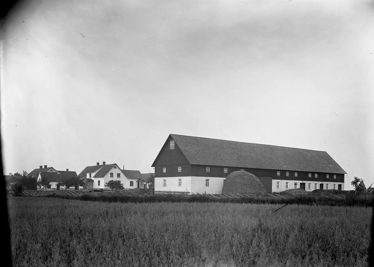Masse har gått ut i åkern för att få en bra bild av gårdsparten med grannen skymtande bakom. Vi ser både manbyggnaden med bakbygge och flygel, samt den nya ladugården. Den hitre delen innehöll en stor lada, ändå tycktes halmen inte få plats under tak. Den bortre delen innehöll tre sektioner med fähus, man ser gödselhögarna utanför. Petterssons på grannparten hade ju byggt en ny imponerande ladugård något tidigare, vilket säkert tilltalat Larssons tävlingsinstinkt, vilket gjorde att man byggde en ännu större ladugård!