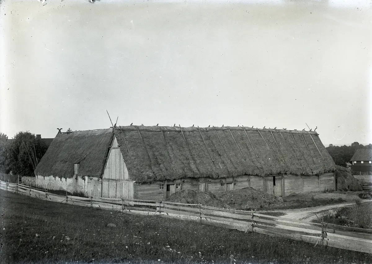 Masse har stått uppe på backen med god utsikt över hela ladugården och tagit denna överblicksbild. Vi ser hela den fina bulladugården med två båsrader i varje fähus och en hoimd, hörum till varje. Stora gödselstackar ligger ut mot vägen. Ladporten står på glänt. Ladan består av tre bulsektioner, vilket är normalt. På gaveln står en stor halmstack. Ladugårdsflygeln i sten är blind ut mot vägen så när som på en port, osäkert vad den ledde till.