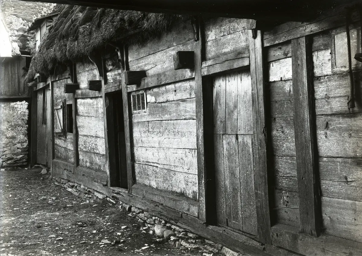På denna närbild kan man tydligt se hur bulladugården är byggd. Den har syllar och syllfoder och rätt breda bular. Mötare, dörrposter och rifoder (den tjockare bulen som bjälklaget vilar på) är inte så kraftiga. Längst till höger har man spikat på en lodstående planka. Dörren är av svaiptyp med en rätt liten svaip och en ganska stor underdörr. Man ser rätt få skador på virket, men ladugården har satt sig lite. Fönstren är isatta senare. Man kan också ana vastknaparna upp under agtaket, vilka bär den vågrätt liggande vastraften, som i sin tur håller emot agen.