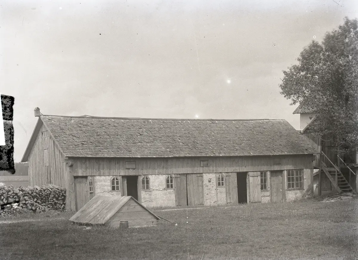 Denna bodlänga stod mellan manbyggnadens bakbygge och ladugården, se Bild 988. Byggnaden verkar ha varit uppförd i trä och pinnmursteknik (en klen bulstomme med tunna stenväggar), av fönstren att döma omkring 1880, då nyromanska fönster av denna typ var omtyckta. Vilka funktioner de 5 bodarna innehållit är okänt, men längst t v var det nog dass. Någon av de stora dubbeldörrarna ledde troligen till en vedbod. Längst t h bör någon form av verkstad eller hantverkslokal ha varit inrymd med tanke på de stora fönstren. Loftet har vädringsluckor, vilket visar att man här haft spannmålsmagasin. Bodlängan revs troligen 1939 då en flygel byggdes på samma plats. Framför t v är en brunn. T h skymtar trappan upp till bakbygget.