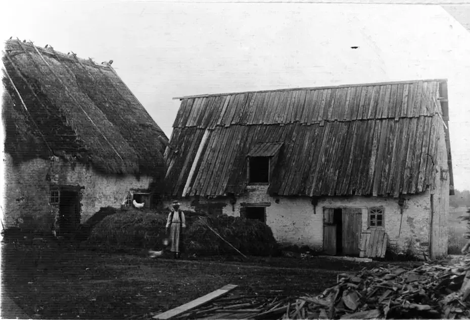De gamla fähusen på bilden ser äldre ut än vad de troligen är. Det var sällsynt med ladugårdsbyggnader i sten före 1800-talets mitt. Den större ladugården t v innehöll troligen kohus, dörrarna är rätt smala, liksom de närmaste i den mindre ladugården, vilken här kunde ha hyst ungnötshus, gödselstacken tyder på det. Men att ha gödselnhögen inne på gården, dessutom obehändigt inne i ett hörn, var lite ovanligt, men inte unikt. Dubbeldörrarna t h kan ha gått till ett stall. Den större ladugården ser ut att ha halmtak (bindtak), medan den lilla har faltak. Virke sågades nästan alltid i 7-alnarslängder (@ 4.20m) och var taket större, fick man skarva som här. Trots de skröpliga taken, var byggnaderna nog inte så dåliga, men gammalmodiga. Nu skulle det byggas stort och modernt! Se Bild nr 992, 993 och 994.