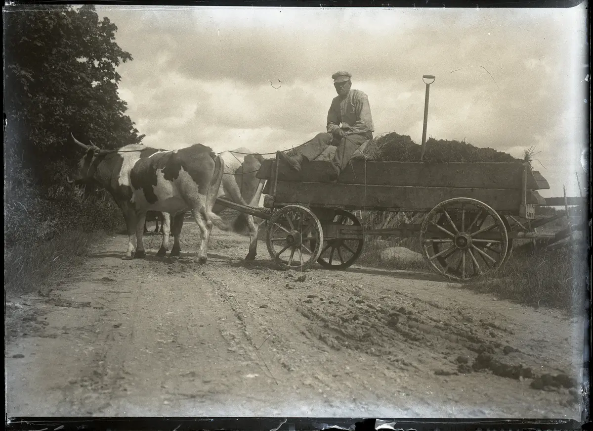 Vilhelm Karlsson är 31 år gammal på bilden, sedan 5 år ingift från Kauparve till Smiss södra gårdspart. V K sitter på en säck och åker med, men om lassen var tunga fick man gå bredvid. Han är klädd i sedvanlig arbetsklädsel: blus, byxor och vegakeps. På fötterna har han troligen läderstövlar.