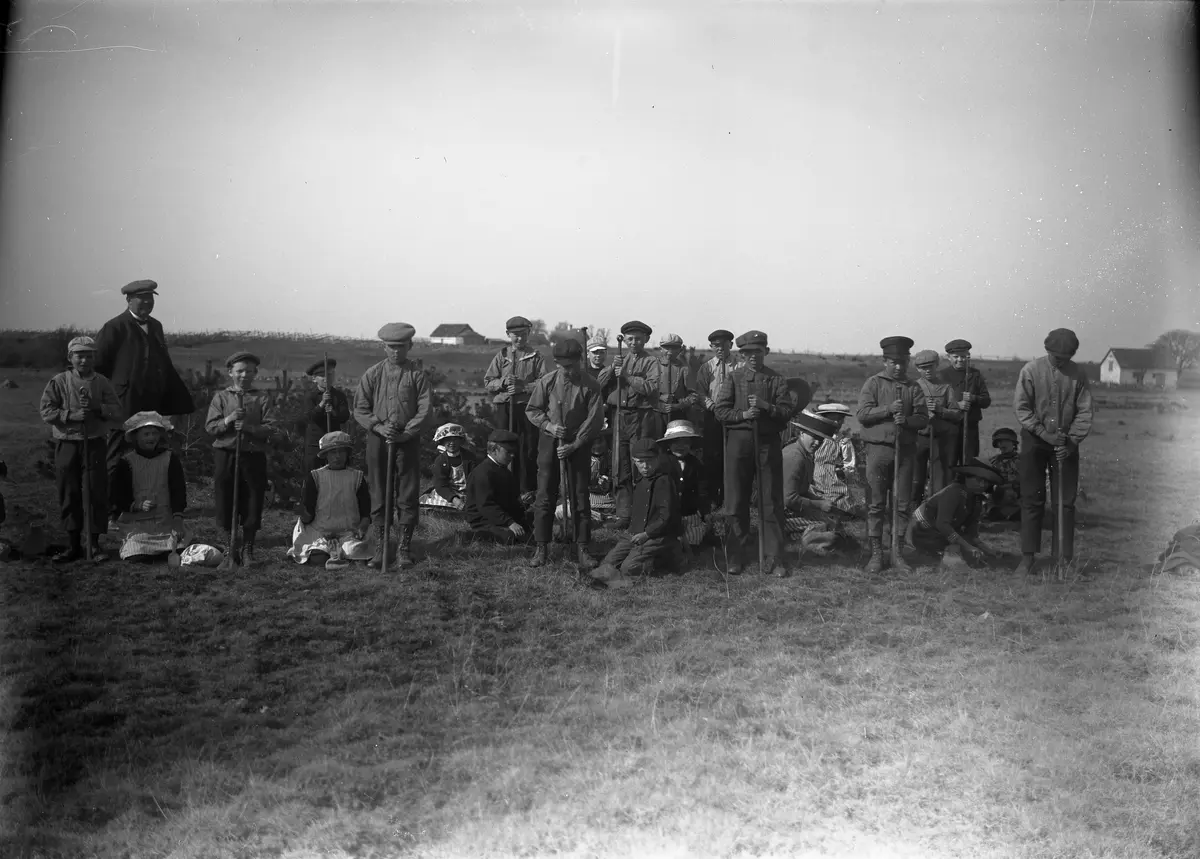 Pojkarna gör tydligen hål för plantorna med spett. Man kan gissa att det är flickorna som skall stoppa ner plantorna i hålen. Söderdal myser och det ser ut att vara trevlig stämning.