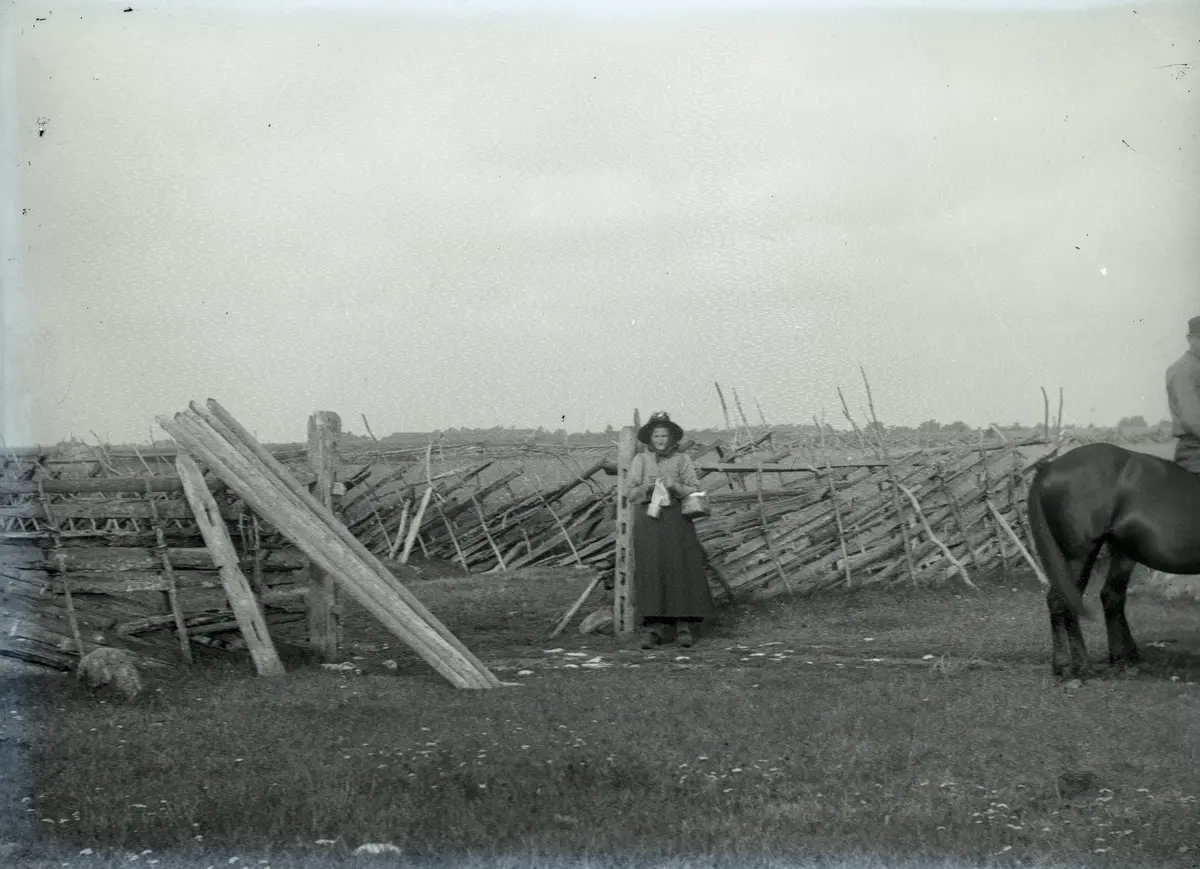 Här har en ryttare passerat och balkarna är urtagna, sk upptäppt lid. Lidfalen står lutad mot tunen, man ser urtagen för lidkrokarna, samt en dekorativ urtagning. Kvinnan håller i en sticksöm, man fick inte gå sysslolös, kvinnorna stickade alltid medan de gick. Möjligen är personerna Maria Elisabet Jakobsdotter med sonen Arvid Larsson.