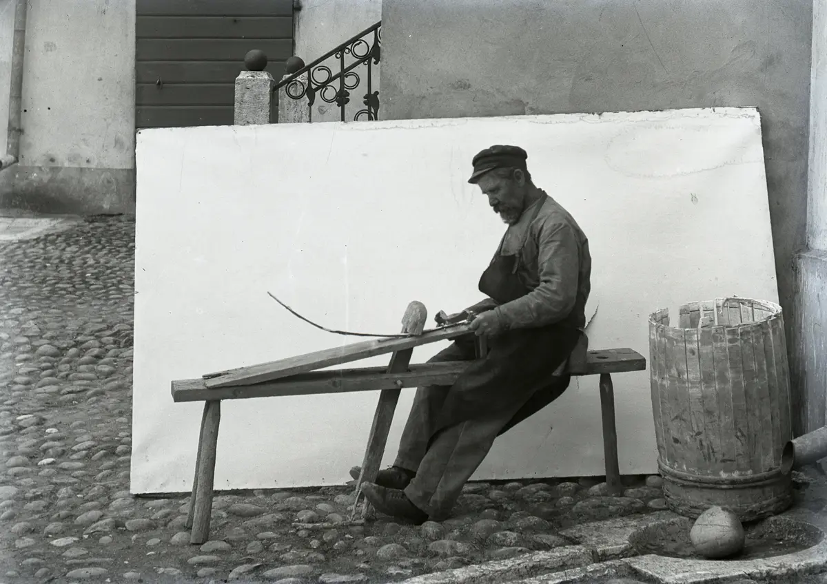 Här sitter en tunnbindare troligen på Fornsalens gård och skär till bandar till laggkärlet som står bredvid. Han sitter på ett redskap kallat bandkränka och spänner banden med fötterna. Han skär till den kluvna hasselvidjan med en bandkniv med handtag i båda ändarna.