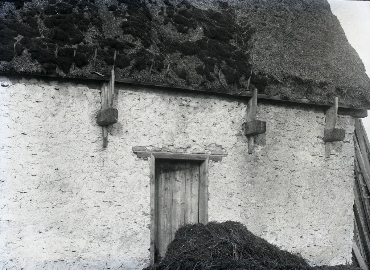 Masse har tagit en intressant detaljbild av agtakets början nere vid väggen. Man ser att man byggt på riskallarnas, bjälkändarnas kilar, med en yttre träbit. Den har i sin övre inre del ett urtag, där ett vastband med helar, stora pluggar, sitter istoppade. Dessa helar håller emot agen så den inte rutschar av taket. Det vanliga på Sudret är annars att helarna sitter snett istoppade i själva hammarbandet, stocken som takstolarna står på uppe på murverket. På norra Gotland har man en vastaraft, vilken motsvarar vastbandet, men den sitter en bit ut ifrån väggen upphållen av självvuxna grenklykor.