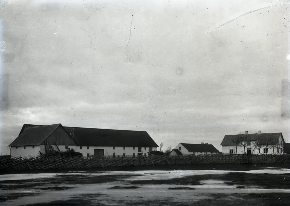 Masse har gått ut på åkern sydost om gårdsparten denna blöta vinterdag och tagit en fantastisk överblicksbild av hela partens bebyggelse. Från vänster ser vi magasinet, den stora ladugården, dasset invid den otroligt långa flygelbyggnaden och till sist manbyggnaden.