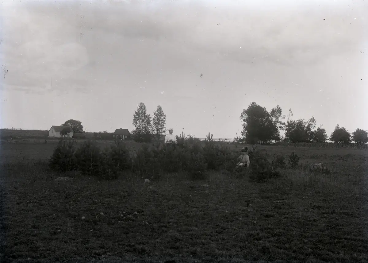 Lausbackar var förr i stort sett skoglöst. Här står Masses fru Majken och dottern Maja vid några tallar, som troligen planterats några år tidigare. Man ser det öppna landskapet runt ikring och i bakgrunden det lilla torp Klintbergs köpte 1907. Här var tidigare åkrar överallt, men nu en bit in på 1900-talet började man överge dem.