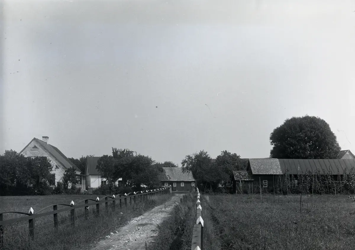 Här ser vi gårdsparten ute från landsvägen. Infarten är densamma än idag, men det är inte några slantunar på sidorna. Manbyggnaden och den nya flygeln skymtar och är sig lika idag. Däremot är alla uthusen utbytta. I förgrunden t h syns en nyplanterad äppelodling, vilken i stor utsträckning ännu finns kvar.