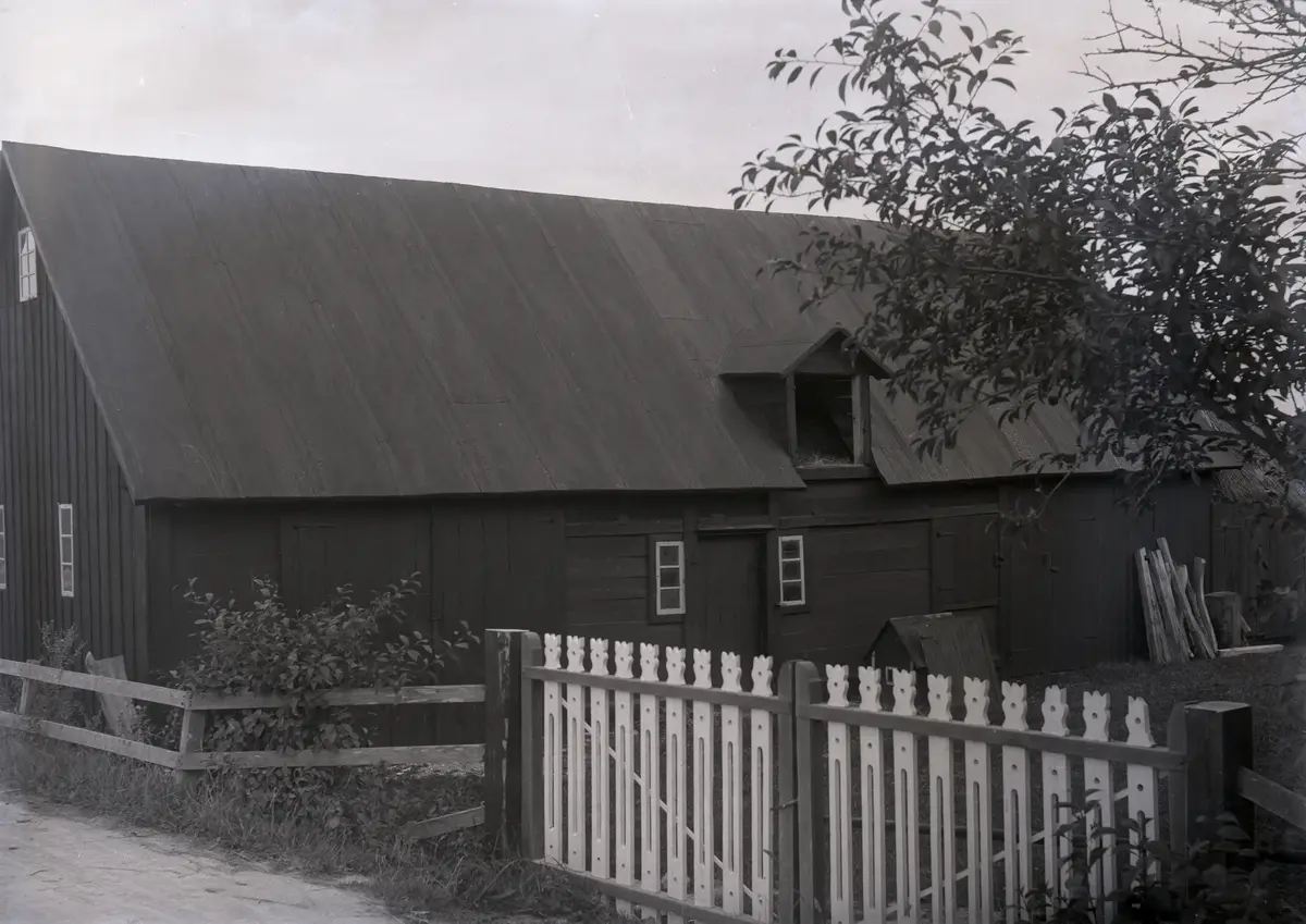 Här är ladugården nymålad och har fått nytt papptak. Fähusdelen i bulteknik i mitten rymde fähus med hoimd till höger. Två laddelar verkar mycket, så den ena har nog tjänat som vagnbod och förråd. Luckan till foderloftet står lutad mot kaninburen. På grindarna kan man se att här bodde en snickare!