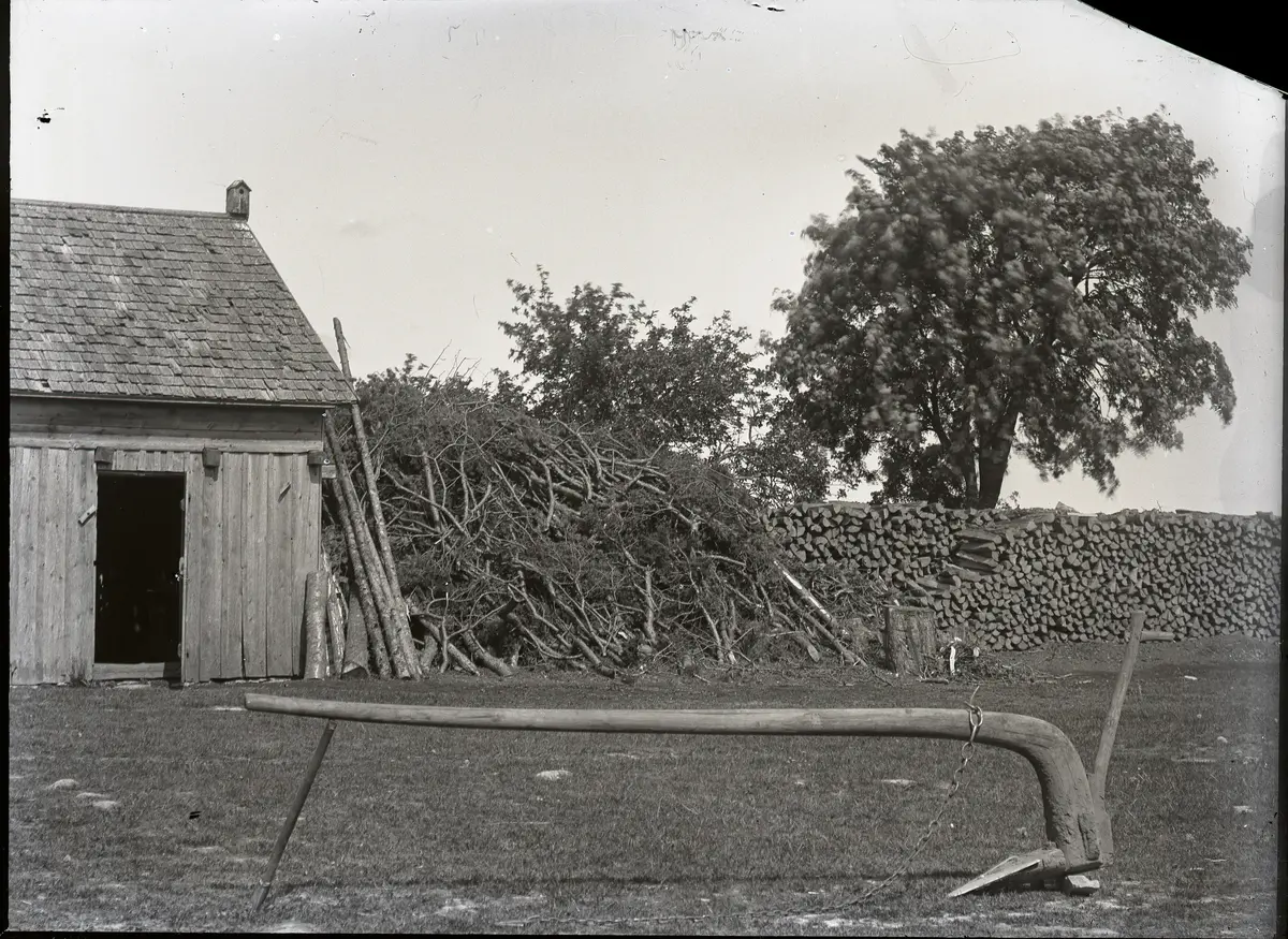 Bilden är tagen på Jakob Karlssons, Fäi-Jakås, gård. Vedboden är ett bulhus klätt med bräder. Taket är täckt med spån. På nocken sitter en en fågelholk, något som förr var vanligt på hus och i träd. Bilden visar också en stor grenhög med ris och två s k flovedsstaplar, ved för den kommande vintern liggande på tork. Grenar högg man i bitar, även ganska grova sådana, medan floveden var så pass grov att den måste sågas, vilket tog längre tid. Ris och smågrenar samt tjocka bitar eldades i öppna spisen, medan medelstor rakvuxen ved användes till järnspisen och kakelugnen. Det gick åt stora mängder och ved var ofta en bristvara.