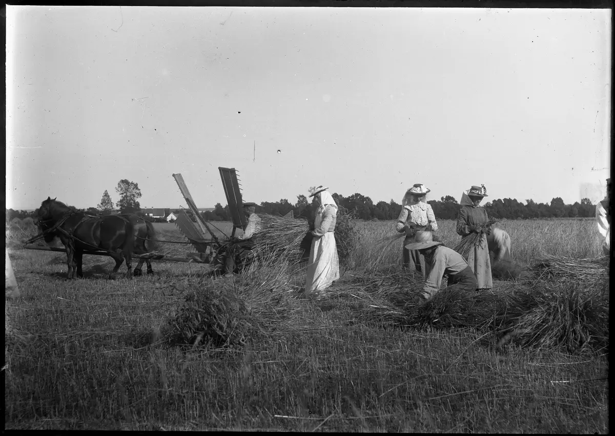 Självavläggaren var en fantastisk förbättring av skördearbetet. Den ersatte flera män med liar, eftersom den skar fort, jämnt och effektivt och la av rågen i lagom buntar. Men dessa måste fortfarande knytas för hand. Här är det många personer i färd med att binda skupar. Kvinnorna är finklädda, för att det är ett högtidligt tillfälle: Emil Christiansson har kommit med en maskin till deras gård och det hela blir förevigat på foto!