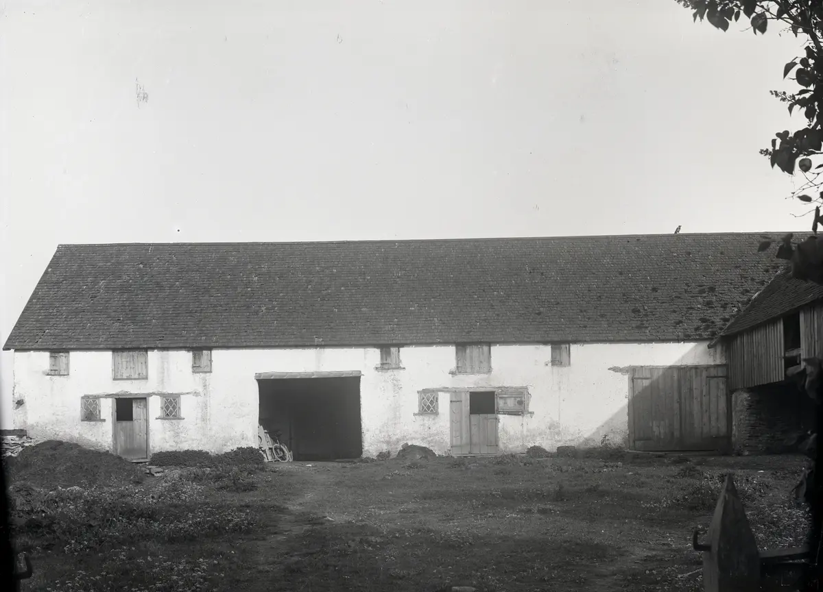 Ladugården lär vara byggd 1883, det kan vara det 30-åriga originalspåntaket som ännu är så här pass bra i skick. De krysspröjsade fönstren är typiska för tiden. T v är ett dubbelt fähus och t h om portlidret, gårdspartens originalinfart, ytterligare ett dubbelt fähus. Sedan kommer ladan med tröskhuset skymtande längst th. Eftersom ladugården låg alldeles intill vägen, var man tvungna att ha gödselhögarna inne på gården. Se också Bild 398.