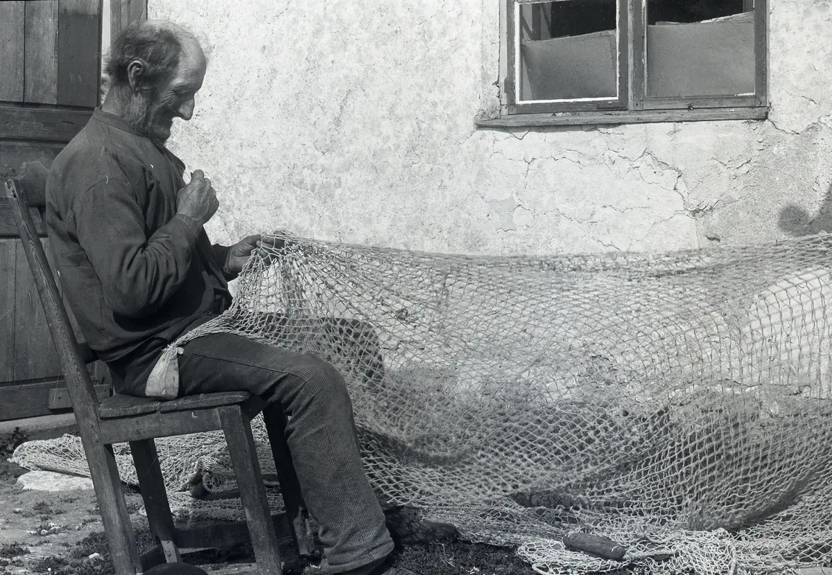 Kauparve Petter Boberg, 80 år, gungar på en högryggig 1700-talsstol i det att han lappar en gammal not utanför manbyggnaden hos sonsonen Lars Nilsson på Kauparve östra part.