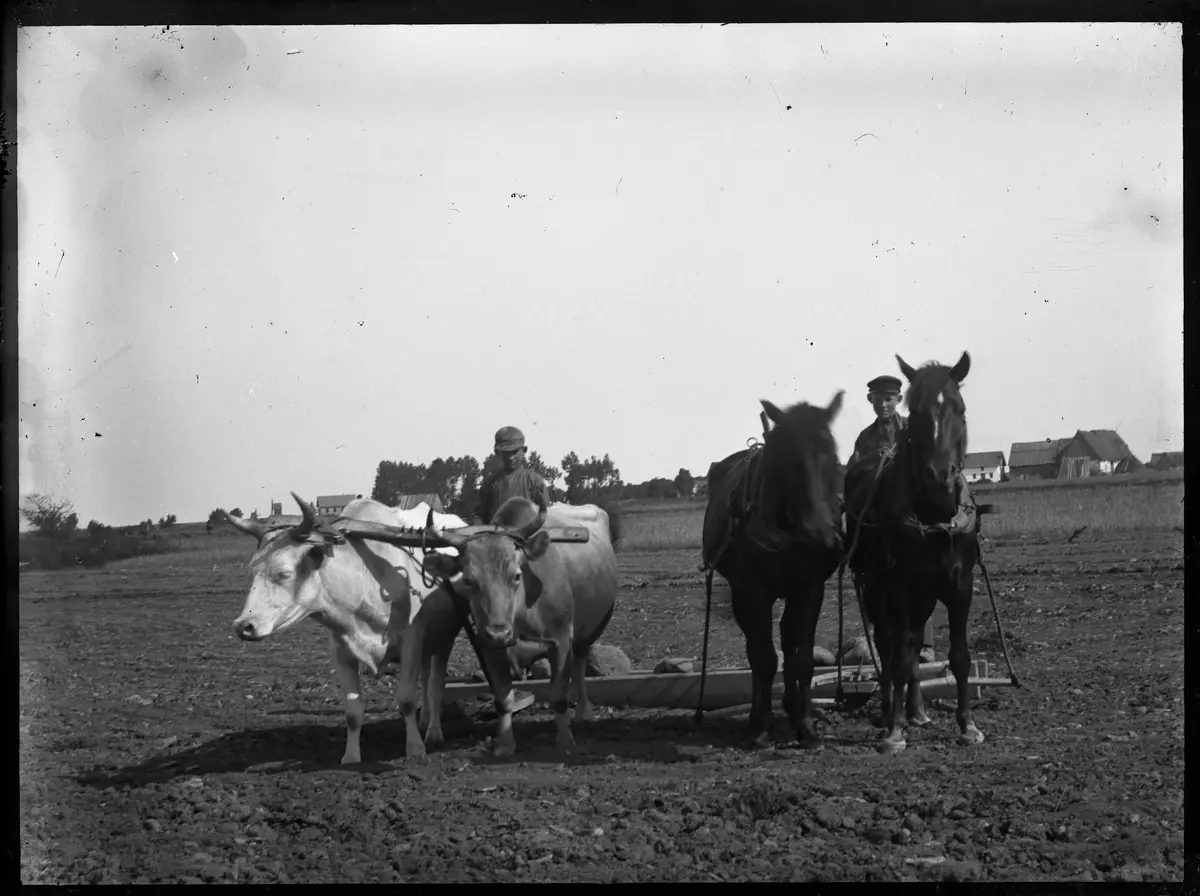 Två pojkar sladdar med ett par stutar och ett par hästar. Uppenbarligen är djuren mycket fogliga, stutar ansågs som särskilt snälla. Att blanda dragare var inte ovanligt, tom hade man särskilda ok, så att en stut och en häst kunde gå i par.