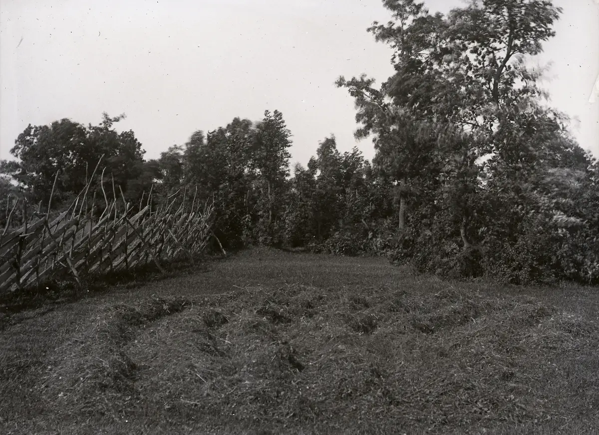 Braidet av hopräfsat hö ligger och torkar i Kauparve änge, möjligen vid Byängsbackar sydost om gårdsparten.