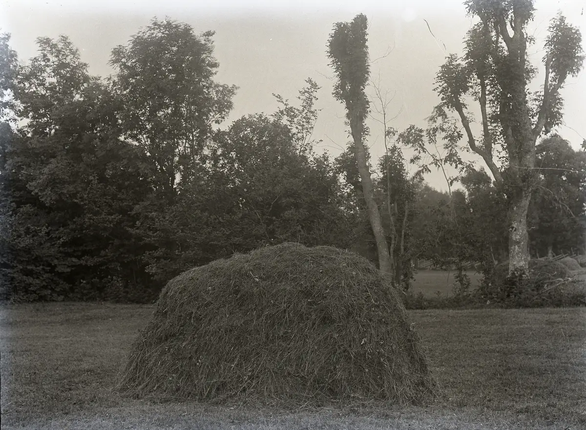 En kiauk var en särskilt stor höstack. Här har Botvide Herman Larsson på Botvides norra part satt ihop kiaukar i änget nere bakom gården. Man kan se två askar i diket mellan åkertvärarna i änget, vilka klappats förra sensommaren. Asklöv var ett viktigt fodertillskott under år då det rått torka.