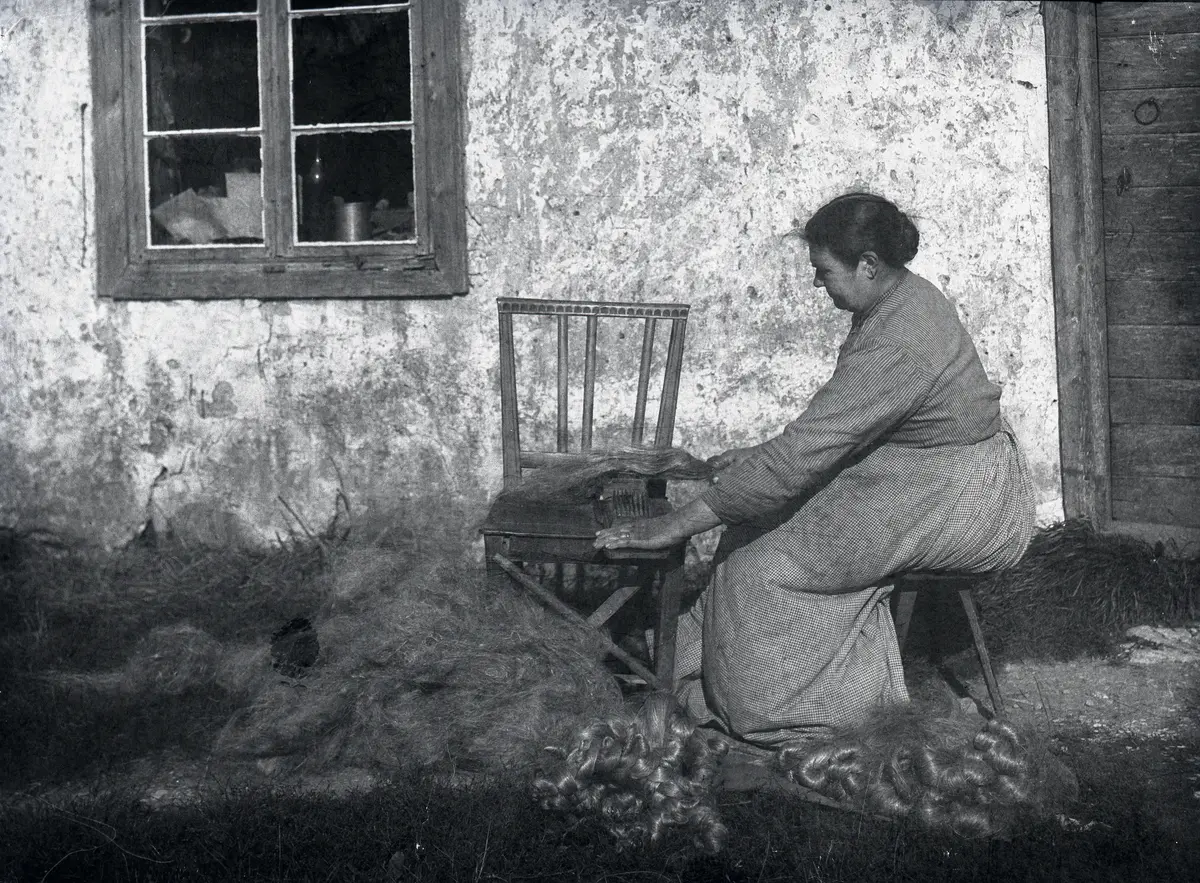 Hallsarve Anna Mårtensson drar bort linets stjälkar från fibrerna med hjälp av häcklans piggar. Det färdiga linet ligger lindat medan stjälkarna ligger i en hög vid stolen. Häcklan har Anna lagt på en uttjänt gustaviansk stol från 1800-talets första hälft. Anna är vardagsklädd utan huvudbonad och har ett stort grovt arbetsförkläde lindat om nedre halvan av kroppen. Se Bild 149, 150, 151.