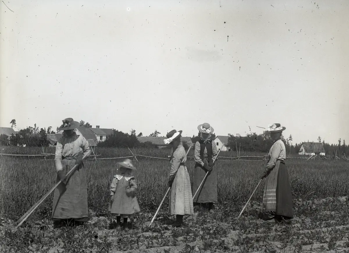 På bilden hackar från vänster troligen Elisabet Danielsdotter, 69 år, barnbarnet Ida Laurentina, 4 år, möjligen barnbarnet Ester, 15 år, troligen dottern Amanda Olofsdotter, 40 år och möjligen dottern Laura, 29 år. De är klädda i bättre arbetskläder med hattar och handskar. Elisabet, Ida och Amanda har grova arbetsförkläden.