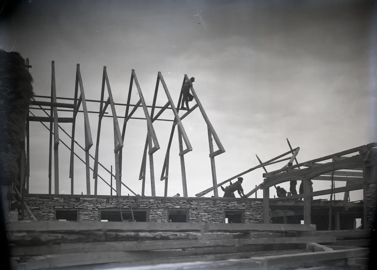 Resningen av de mycket höga takstolarna ser en smula vådlig ut! Att takstolarna står på så höga "stolpar" beror på att man avser att göra ett högt foderloft med brädpanel ovanpå fähuset i sten. Den totala takhöjden blir den samma, men volymen på loftet blir mycket större genom träväggen och taket blir därigenom betydligt flackare.