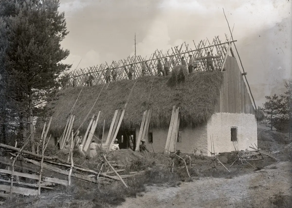 På denna bild har man kommit lite högre upp. Det verkar huvudsakligen vara kvinnor som arbetar på marken, medan karlarna är på taket. Synd att Masse inte var med heladagen. Se Nr 269 mfl.