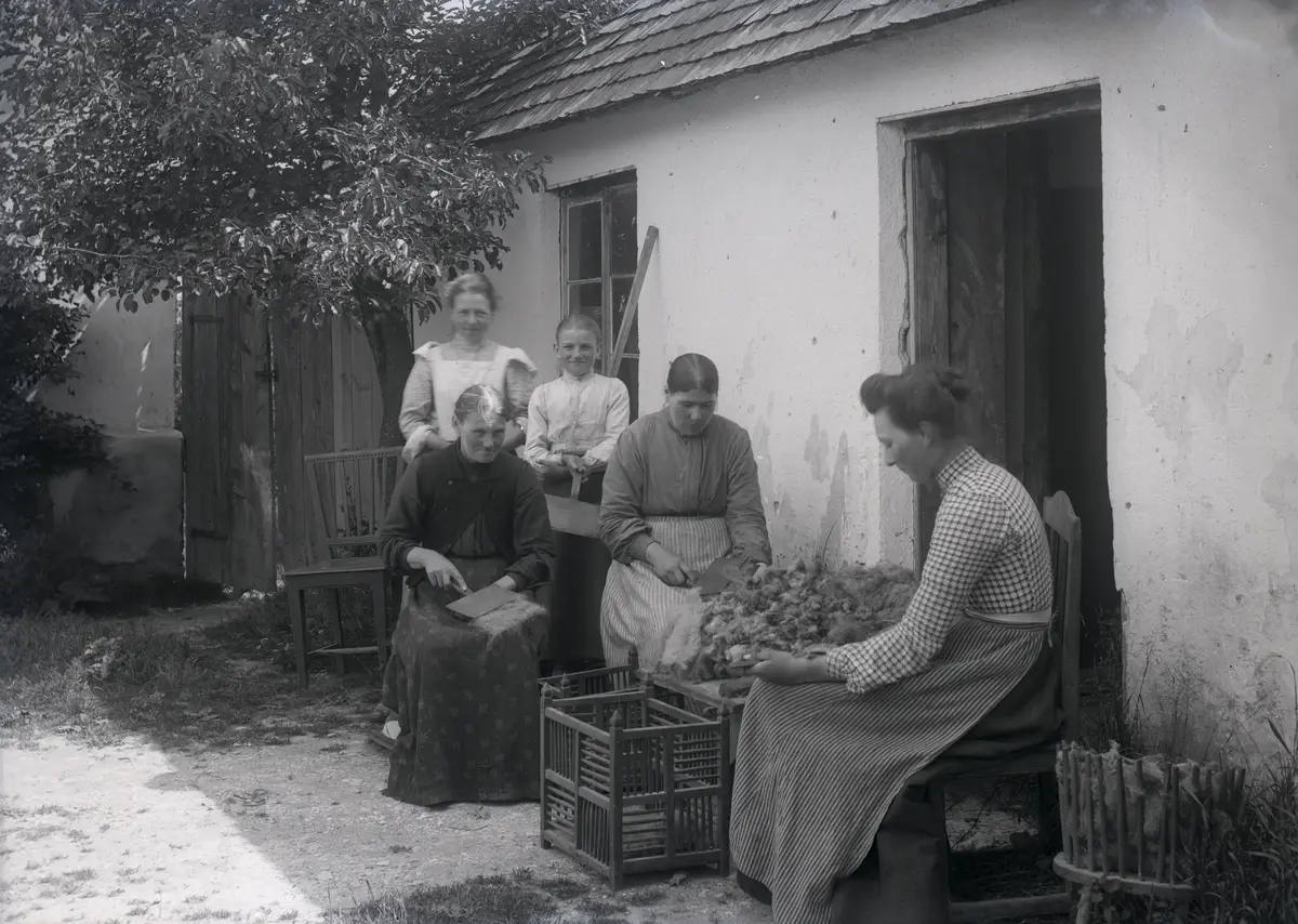 Kvinnorna sitter ute och kardar, det är ett smutsigt arbete, som kan vara bra att göra utomhus om det är fint väder. Den färdigkardade ullen läggs i en traditionell gotländsk s k saigkorg. Längst th står en likaledes vanlig ullkorg. De högra kvinnorna har mellan sig satt upp någon slags skiva med ull på. Den högra kvinnan sitter på en högryggig 1700-tals barockstol. T v står en gustaviansk stol från 1800-talets första hälft. De sitter förmodligen intill brygghuset.
