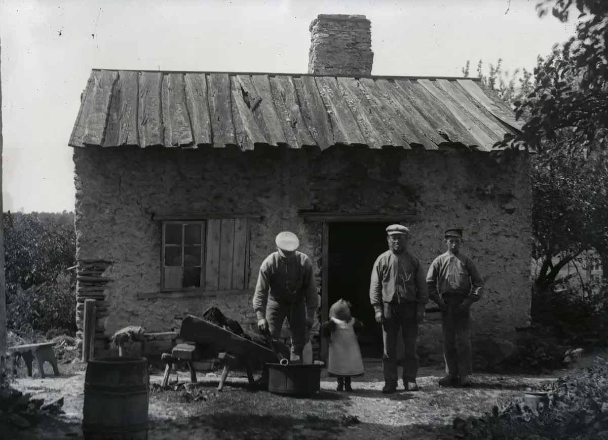 Hallbjäns Oskar Danielsson, 34 år, färgar garn i en stor gammal koppargryta utanför smedjan (?) på gamla gårdstomten. Bredvid står dottern Annie, snart 4 år, svärfadern Jakob Larsson, 54 år, pojken t h är än så länge okänd.