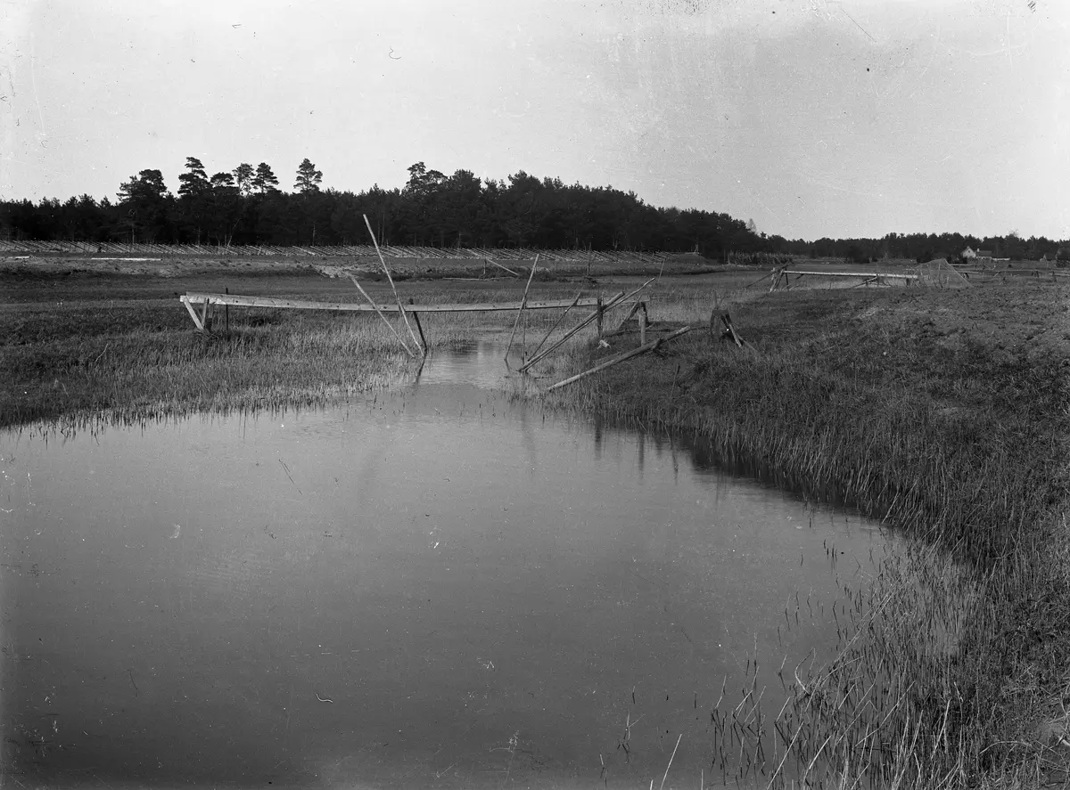 Ryssjanläggning med en ryssja utlagd i ån, där arm-, tumling- och stjärtstakar som håller ryssjan på plats är det enda som syns ovan vattnet. I bakgrunden finns ytterligare en anläggning.