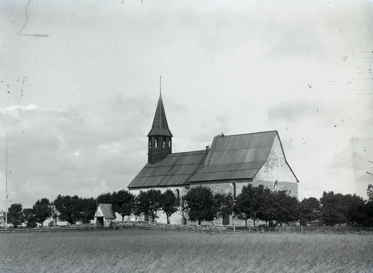 Masse har tagit denna bild stående i rågåkern söder om kyrkan. Han har medvetet valt motivet så att skolan inte finns med, dess östra hörn måste finnas alldeles utanför bildens kant t v. Handelsföreningens affär i vägskälet t h är ännu inte byggd. Kyrkan framträder monumentalt. Uppe på taket sitter ett gäng nyfikna ungdomar (?), hur har de kommit upp dit?