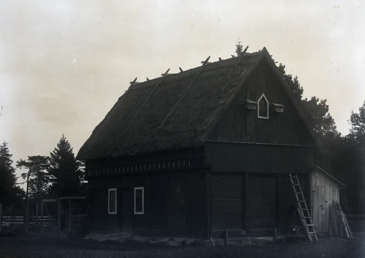 Oskar Jakobsson har byggt en fin liten ladugård. Den är intressant för han har byggt fähusdelen i bulteknik, vilket är mycket sent i början på 1900-talet. Man ser att virket är klent, men välgjort. Foderloftet är i resvirke och taket är täckt med halm. Ladugården är mörk på bilden, så antingen är den tjärad eller struken med Falu rödfärg. På baksidan har Oskar precis byggt ett skjul.