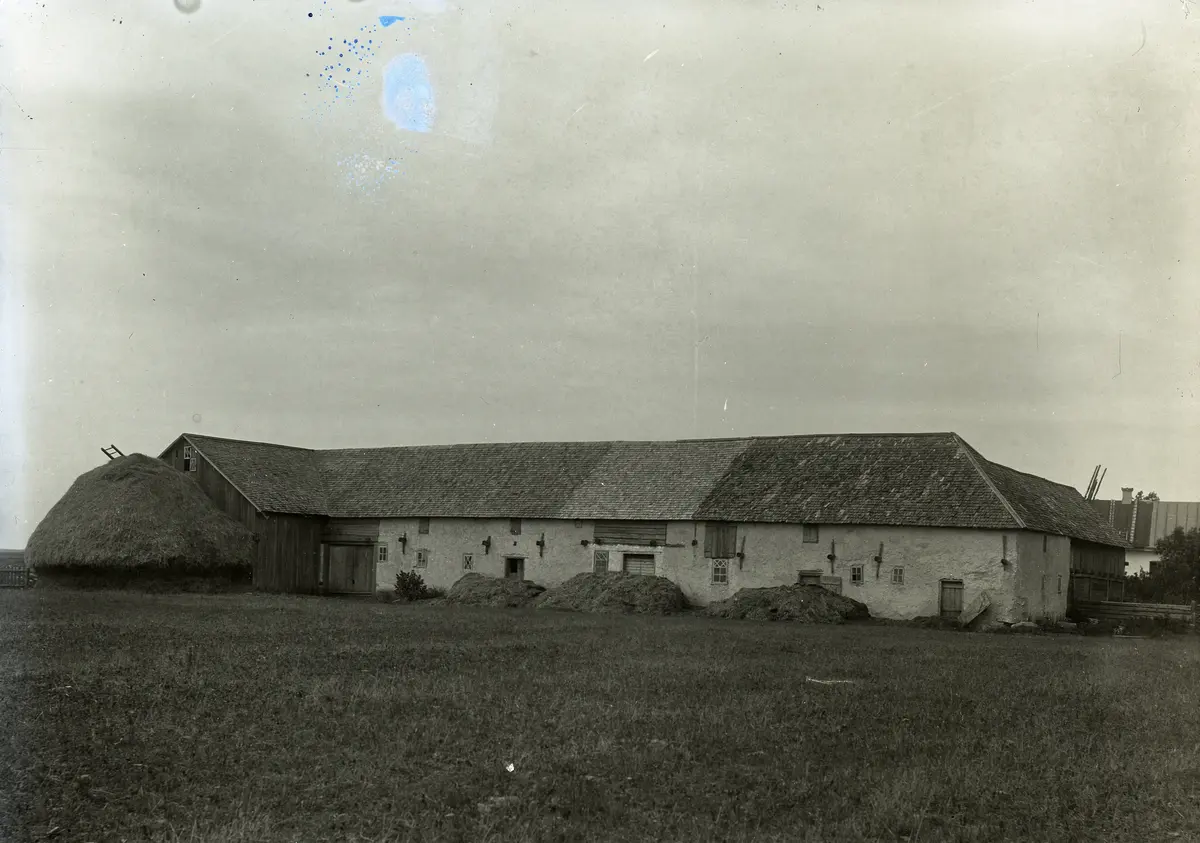 Här ser vi det stora ladugårdskomplexet bakifrån. Bjälkändarna med ankarträn tyder på att ladugården är äldre än spåntakstiden. Troligen har den varit en riktigt lång agtäckt ladugård, innan man på 1880-talet tog bort hela taket och gavelspetsarna och gjorde nytt tak täckt med spån, sammanbyggt med de vinkelställda uthusdelarna. I mitten har det nog funnits ett portlider, där har man inrett ytterligare ett fähus, nu finns det tre stycken stora och ett litet längst till höger.