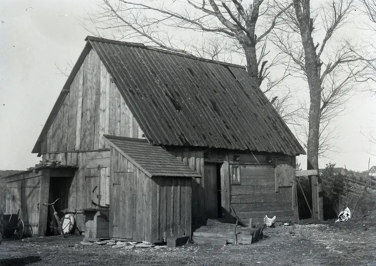 Denna lilla bulladugård är äldre än boplatsen, Lyander måste ha köpt den. Frågan är om den är en ladugård från början, formen liknar mer ett bostadshus. Ladugården kan ha rymt en ko, en kalv, en gris och några höns. Skjulet t h är nog ett dass, men det där cykeln står är inte lätt att veta, en redskapsbod kanske.